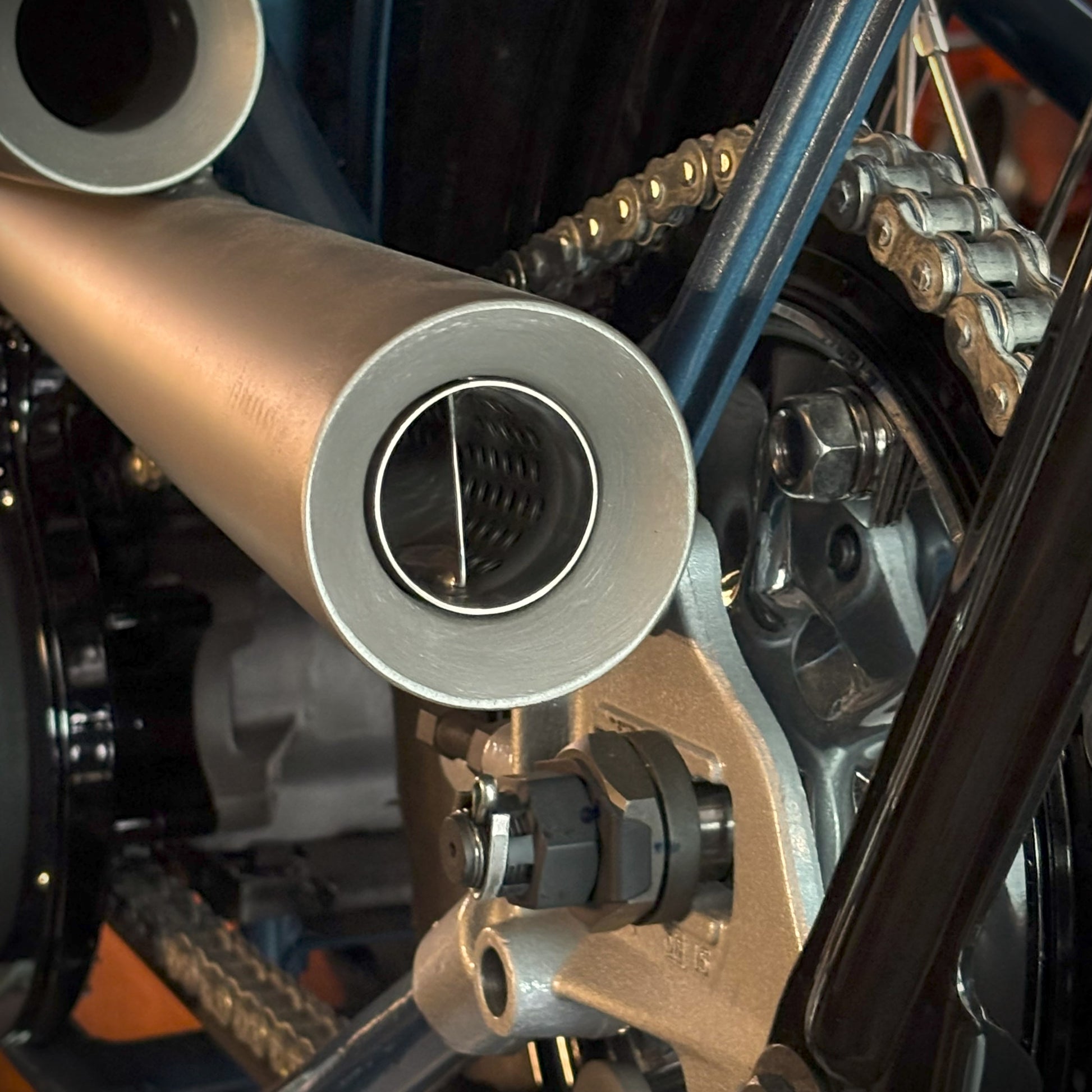パイプ形状でサイレンサーが無いマフラーの場合、音量を下げようとすると排ガスの出口を塞ぐことになってしまい、出力低下の原因になります。最悪の場合エンジンがブローすることにもつながります。